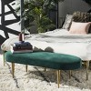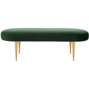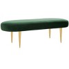 Enhance your living space with the Corinne velvet oval bench. This stunning piece combines rich emerald velvet with elegant gold metal legs, offering a touch of sophistication to any decor. Whether placed at the foot of a bed, in a hallway, or as a centerpiece in your living room, its classic silhouette captures attention.