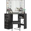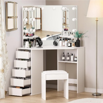 Corner Dressing Table with Mirror and Light, 3 Lighting/Brightness Adjustable, Dressing Table Set with 5 Sliding Drawers/Shelf/Dressing Stool, Black