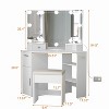 Feature:Elevate your beauty routine with this modern corner makeup vanity set, designed for style and functionality.This chic vanity table features a lighted mirror that provides perfect illumination for makeup application, ensuring you look your best at any time of day.The built-in power outlets offer convenient charging for your beauty devices, removing the inconvenience of looking for outlets.Crafted from premium engineered wood, this vanity set features a sturdy structure and a smooth, waterproof surface that is easy to clean, making it ideal for everyday use.With spacious drawers and open shelves, this vanity table with lighted mirror provides ample storage, keeping your space organized and clutter-free. A dedicated brush holder ensures your makeup brushes are easily accessible and well-organized.The included cushioned stool adds comfort, allowing you to sit for extended periods while getting ready.Perfect for small bedrooms, this white vanity desk effortlessly fits into any corner, combining elegance with practicality.