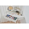 - Generous Organization Options: With its wide tabletop, spacious drawer, and convenient display shelf, this vanity provides plentiful room to store cosmetics, brushes, and accessories—keeping your area tidy and well-organized. Its corner-friendly design is perfect for optimizing space in smaller bedrooms or bathrooms without sacrificing usability.