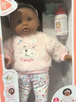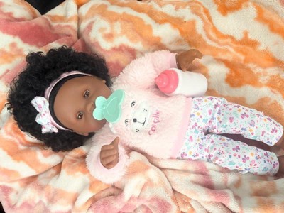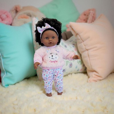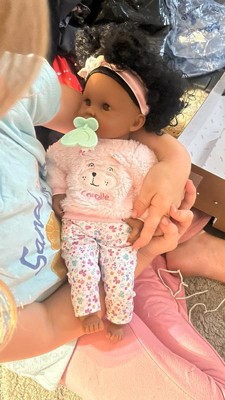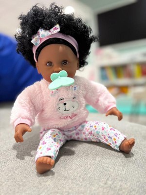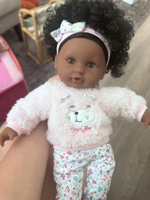 Bebe Calin Caroline is a 12" baby doll perfectly sized for little ones to cradle and cuddle. Designed with a soft, poseable body and delicately vanilla-scented vinyl face, arms, and legs - a signature Corolle touch - this doll provides a realistic play experience. Caroline's brown sleepy eyes gently close when laid down, just like a real baby. She comes dressed in a removable furry teddy bear sweater, floral pants, and a matching headband, with a floral-printed body underneath. Featuring a beautiful head of dark curls, Caroline also includes a feeding bottle for added nurturing fun.