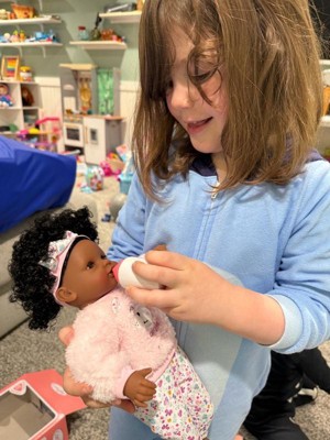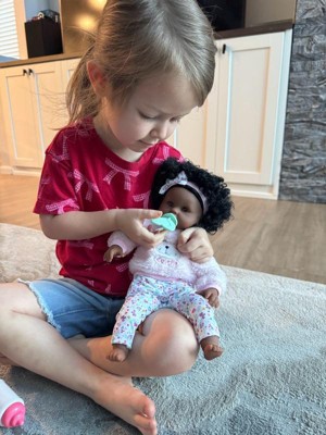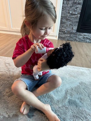 [This review was collected as part of a promotion.] My daughter is going to be three soon and she loves her baby doll. The doll is small enough that it is easy for her to carry it around. The doll comes with a small pacifier and a bottle so your little one can enjoy pretending to feed and take care of their baby. She has beautiful curly hair and her eyes open and shut depending on if she’s sitting up or laying down. She also has a vanilla sent to her that seems to be very calming for my daughter!
