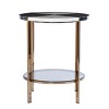 Modernize your design with this round accent table. Black and white simulated marble enhances your look, while champagne metal inlays add additional detailing. Neatly tuck clutter away on the smoke-tinted glass shelf or display decorative itemsto finish out your design. Complement your contemporary decor when you place this faux marble accent table alongside your sofa or between a pair of modern armchairs.