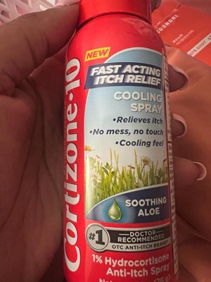 Stop the itchsanity with Cortizone-10 Maximum Strength* Soothing Aloe Itch Relief Cooling Spray. Formulated with 1% hydrocortisone, this anti-itch liquid starts working fast to cool skin and relieve itch associated with minor skin irritations, inflammation, and rashes due to eczema, psoriasis, insect bites, seborrheic dermatitis, poison ivy, oak, sumac, detergents, jewelry, cosmetics and soap. Cortizone-10 Soothing Aloe Itch Relief Cooling Spray is enriched with aloe that helps soothe skin and sprays a fine mist, allowing you to target hard-to-reach places. It's the perfect addition to first aid kits, outdoor gear and travel essentials, so itching from pesky mosquito bites doesn't ruin your time outdoors. No wonder it's the No. 1 doctor-recommended OTC anti-itch brand**.