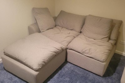 [This review was collected as part of a promotion.] I am really enjoying this ottoman. I combined this ottoman with the armless chair and the corner chair to fit in the corner of a basement room to make a little sectional couch. The ottoman itself is very soft. Due to the neutral gray color, I can see this being used with other chairs rather than sticking with the collection. The color is more silver than brown but it fits perfectly in my space. The box was actually labeled Silver Gray. It is very comfortable and cozy and both my kids love the sectional that I made using this ottoman (they only go lay on it now and have forgotten about all our other spaces). It comes in a box with the feet in a zipper beneath the chair. There are holes in the bottom corners to screw the feet into making assembly very easy. It is not heavy so I was able to get it in my home and down my carpet stairs myself. However, it feels substantial when you lay on it. I love that it comes as one piece so you can design your own couch by picking and choosing the number of chairs, corner chairs and ottomans you need. Overall, I’m thrilled with this ottoman and look forward to many years of use. I have included a picture of the ottoman alone as well as how I have it arranged.