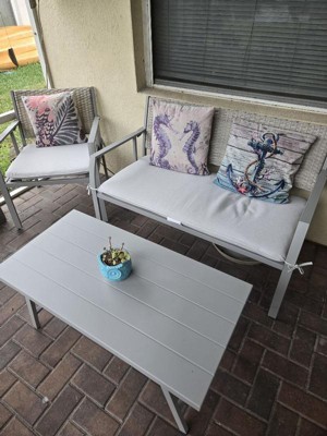 [This review was collected as part of a promotion.] Really convenient easy to take out of the box and set up outdoor furniture set. Weather resistant and simple. Doesn’t seem the sturdiest but for a little outdoor set it works