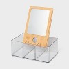 Get ready for the day conveniently using the Cosmetic Storage Container with Bamboo Lid from Brightroom™. This cosmetic container features divided compartments that provide ample space and organization, as well as a lid with a built-in mirror to make getting ready quick and easy. Made from bamboo and plastic, this rectangle storage dispenser is a practical addition to your vanity.