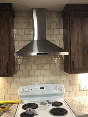 We recently installed this hood into our kitchen and we love it. We were a little worried about the top not being long enough but it came with enough give to fit our space and more. It goes beautifully with our new stove and backsplash.