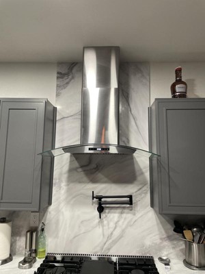 We recently installed this hood into our kitchen and we love it. We were a little worried about the top not being long enough but it came with enough give to fit our space and more. It goes beautifully with our new stove and backsplash.