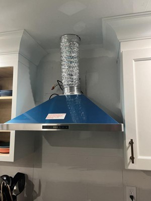 We recently installed this hood into our kitchen and we love it. We were a little worried about the top not being long enough but it came with enough give to fit our space and more. It goes beautifully with our new stove and backsplash.