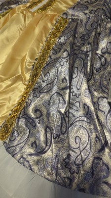 • COSTUME INCLUDES: Dress featuring a short Marie Antoinette-style silhouette crafted from pink brocade-print fabric, adorned with gold trim and a middle panel.