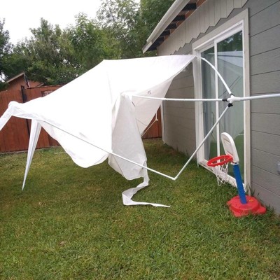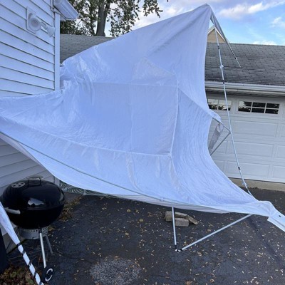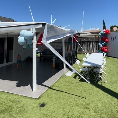 This product has received mixed feedback from guests, with some praising its ease of setup and sturdiness for short-term use, particularly for events like graduation parties and summer gatherings. However, many guests expressed concerns about the quality and durability, noting issues with plastic connectors and overall construction. While it fits well in various settings, guests recommend caution for long-term use due to its tendency to break under wind and rain.
