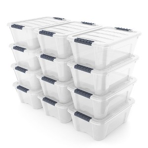 This is ournew plastic storage tote which is a great ideal for organizing and storing small items in the closet. Transparent design make you easy to see what's inside. Two grooves in side to help you lift, and the transparent lid snaps firmly onto the base to keep contents contained and secure.12 PCS plastic storage tote are able to neatly stack, to maximize storage space.