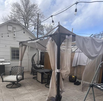 I have had this for 7 months and it is 100% ruined. This pergola is NOT weather durable. The entire cover was literally shredded from a little windy day (as you can see in the photo, the hanging tea lights are still perfectly intact), and the metal bars bent from a snow day.
