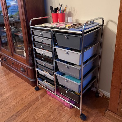 I’m very happy with purchase that I call my Art Cart. It has a huge amount of storage drawers accommodating all of my collage material with a couple of spaces still available! It looks great and exceeded my expectations.