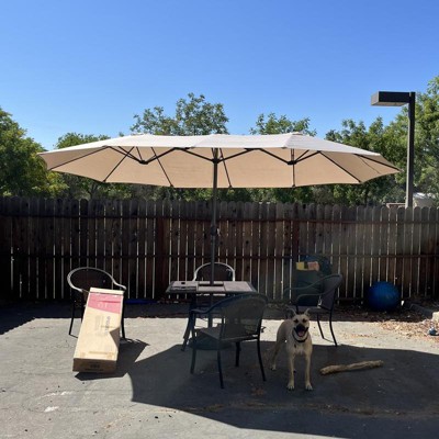 Dimension of Double Patio Umbrella: Overall dimension: 15Ft X 9Ft X 8Ft(L x W x H), diameter of umbrella pole:48mm, And NO INCLUDE UMBRELLA BASE