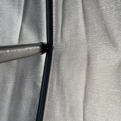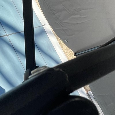 This is our second one of this style and love it. We ordered the first one from the originating company. This one from target was basically the same but the side braces for the base are plastic and the umbrella fabric seems a little lighter than the other one. This one from Target works perfectly and does what we need it to do. We love it!! I highly recommend.