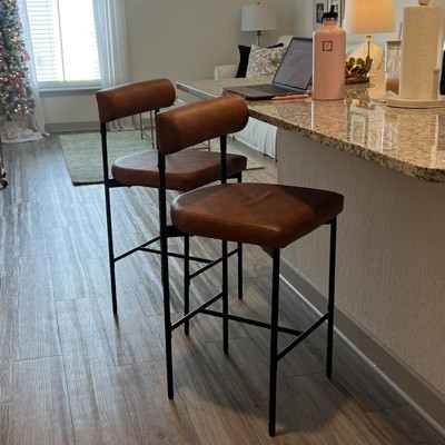 The faux leather upholstery and sponge filling seat not only offer an upscale look but also provide superior comfort. Additionally, each bar chair features a supportive backrest and humanized footrest for extra ergonomic comfort. Sturdiness is assured with the metal frame, rubber wood and plywood materials, giving the set a solid foundation. Adjustable foot pads anchor the bar chairs to enhance great stability. With an ideal counter height of 26 inches, the bar stools set is ideal for most kitchen islands or bar counters. Whether you are enjoying a meal, sipping on a drink, or engaged in a lively conversation, these bar stools can provide a versatile seating solution.