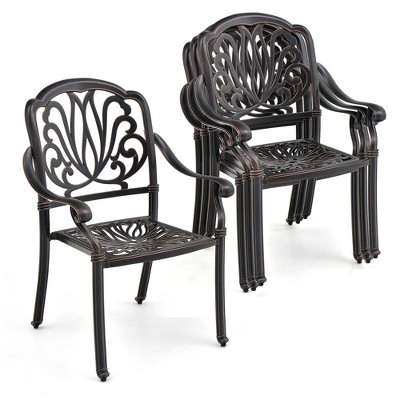 Costway 2 PCS Patio Cast Aluminum Dining Chairs Armrests Outdoor Stackable Brown/White