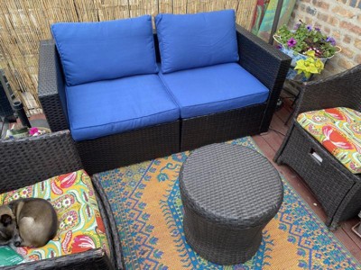 This thing is a pain to put together. None of the screws lined up with one another and I had to actually drill new holes to even get it to go together. Super flimsy and the plastic/wicker is already unraveling in places and I haven’t even put it on my patio yet. I wanted to love this because it is the perfect size I was looking for but the quality is sub par.