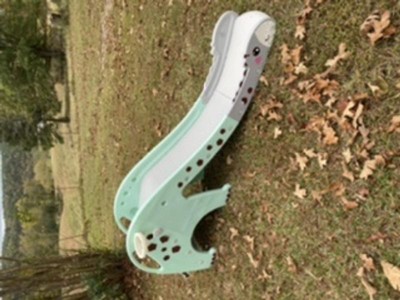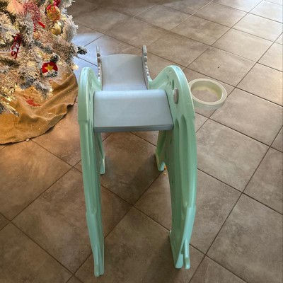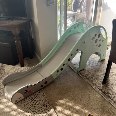 This was a gift for our 1 year old granddaughter. The dinosaur shape is adorable and the sturdy base is a plus. it's also not a steep as some of the other slides we were considering. The spots on the dinosaur are actually stickers so that was kind of a pain to put on. it's currently being used indoors so hopefully will preserve the the slides condition. It was fast and easy to assemble and arrived a day earlier than expected. it was slightly more expensive than we wanted to spend but overall happy with our purchase and definitely would recommend.