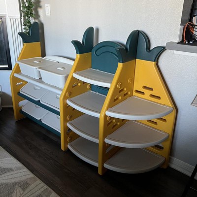 We have a 19 months old girl at home. Who has a lot of toys and books. She has two toy storage and one book shelf already in her playroom. But she likes to play with us in the living room sometimes too. This one is perfect for our living room, it can store toys and books at same time. And very easy to build without any screw. It makes my living room looks much tidier and clean.