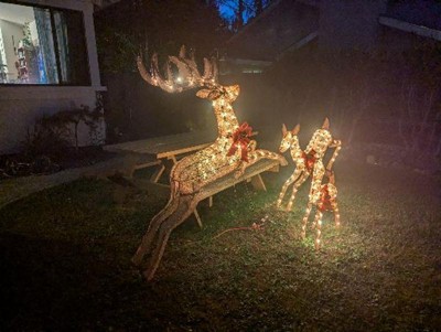 I received so many compliments for this reindeer decoration. It's a true gem for holiday enthusiasts! From the moment I unpacked the set, I was impressed by the quality and attention to detail. The warm white lights are not only plentiful but also emit a cozy and festive glow.Assembly was a breeze, and the sturdy construction ensures these reindeer withstand the elements. The inclusion of stakes proved invaluable, providing stability for outdoor use even in windy conditions. I appreciate the thoughtful design that strikes the perfect balance between elegance and whimsy.I recommend it to those seeking to elevate their festive decor. These reindeer have exceeded my expectations, and I'm thoroughly pleased with my purchase.