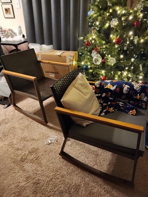 • Suitable for Various Places: The 3-piece patio furniture set allows you to enjoy leisure time with your loved one. Including 2 rocking chairs, 2 seat cushions and 1 coffee table, the rocking chair and table set is widely used for porch, poolside, balcony, courtyard and more.
