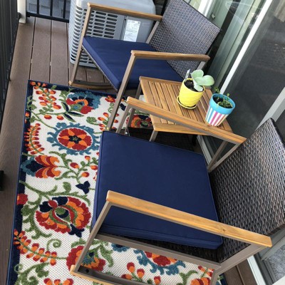 Bought this set for an apartment balcony and it is a perfect fit. Easy to assemble. Light-weight but feels sturdy. Material seems weather resistant. I would recommend a back pillow for added comfort.