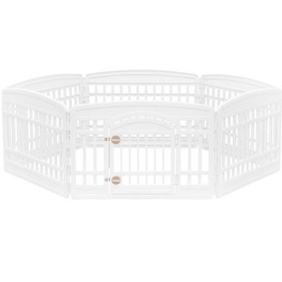 The adaptable pet playpen can transform into a playpen or fence, perfect for small to medium-sized dogs with its 6 32" high panels. Crafted from HDPE, the pet fence is all-weather, enduring, and easy to maintain. Moreover, it includes a secure lockable door for added safety. Suitable for both indoor and outdoor use, it features suction cups and ground stakes for stability. Easily collapsible for portability and storage, this playpen is ideal for homes with limited space. Thanks to its tool-free assembly with interlocking connections, setting up this portable dog playpen is easy and quick.