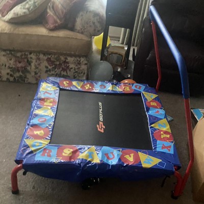 When my niece and nephew come over, they want to go out on the bigger trampoline. However, in bad weather, I needed something indoors. I found this toddler trampoline. It's a nice size and looks safe, carrying up to 330lbs, and I decided to get one of those. I was not disappointed; this one has worked out great. First off, very easy to assemble. I like how easy this one was to assemble. I like how the instructions were very easy to follow, and I had this one together in about ten minutes. I also like how many springs per inch and how tight they make the mat and it takes a little pulling with the included tool, and once done, it is very sturdy to bounce on and solid and safe too. Secondly, it bounces great. I like that I can bounce on it, and it holds me really well without bottoming out. I also like how it has plenty of bounce for my six-year-old nephew too. I also like how the bar is easy to grab and even comfortable hanging on it while bouncing. Lastly, it is safe. I like how sturdy this one is to the ground, it does not wobble, and it doesn't bounce off the ground either when going high on it. I also like how the springs are so close together, and with that thick mat, even when bouncing on a spring now and then, it held up and never went through. No cons, it worked out great for me, and I am very happy with the purchase.