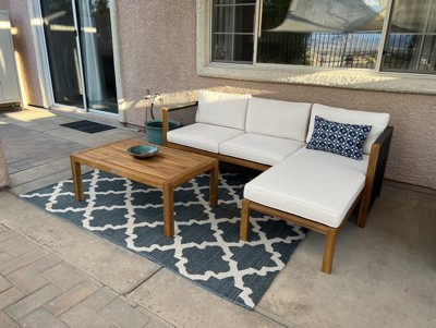 Very happy with this patio set. It was lower to the ground than I anticipated, but I like it. Solid wood pieces, super easy to assemble, and the cushions are memory foam-like. Bought on sale for half off, excellent purchase.