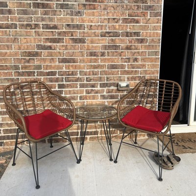 I returned this, which was a painful process for a multitude of reasons. I was very disappointed in this set. It isn’t rattan. It isn’t comfortable. Some of holes (for the screws on the chair bottoms) were not the right size making it hard to assemble. Part of the plastic “rattan” was already unraveled on one chair, when received.