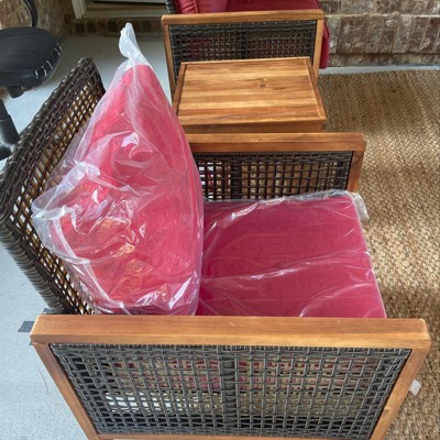 Would you like to have a comfortable and charming outdoor leisure experience? This is our 3pcs outdoor patio furniture set with natural appearance. Made of rattan and acacia wood, this patio set is weather-resistant and sturdy enough for long term use. And the reinforced structure enhances stability and load-bearing capacity. The chair has wide armrests and backrest, and is equipped with thick cushions, which can provide you with extreme comfort. What’s more, it also includes a coffee table with 2 storage racks for convenient use. The stylish design and classic appearance allow the conversation set to fit any surroundings. You can use it in anywhere you like, such as garden, balcony, or backyard. If you are looking for patio wicker furniture set like this, do not miss it!