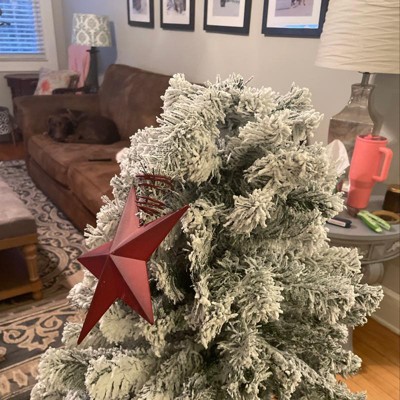 Lovely little tree! After 40 plus years of a large tree, we wanted to do a mini tree as to not take up too much room, or to do all the work involved too. We put this 4.5 foot tree on a corner table. The top single branch (star holder) is about 6”, so we turned ours over and made it more fitting. The snow flocked branches are beautiful! And the shape is perfect after you open the branches as directed. It’s 3 simple pieces! Our photo only shows lights, it hasn’t been decorated yet. That’ll happen next week. We highly recommend this tree!