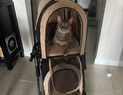 I like that this stroller has two carriers for walks or trips to the vets if you have 2 cats or other pets. It is the lowest priced stroller that has 2 pet carriers that I could find online. However, the drawback is that the carriers middle supports are made of a metal wire that becomes misshaped or bent affecting the overall shape of the carriers. I ordered the stroller a second time to compare which was the best out of two. For close to $150, I expected the item to be packaged and shipped in a way that doesn’t compromise the design of the carriers.