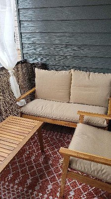 Love the look of this wood set! It's sturdy and well-made, and the cushions are a nice soft color that goes well with our patio. Definitely recommend this set.
