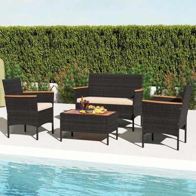 Costway 4 PCS Patio Rattan Furniture Set Glass Table Shelf Sofa Cushion