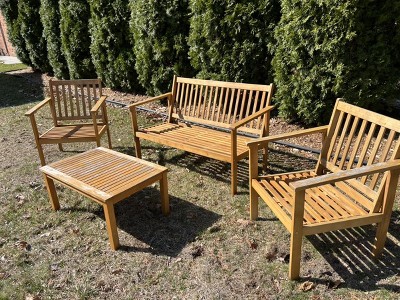 I love the price for four pieces. Beautiful, oak wood look. I did assemble myself. It took a little bit of time and but worth it!. I have purchased covers , I live in a very sun filled, hot city, I am trying to keep the color by keeping them cover when not in use.