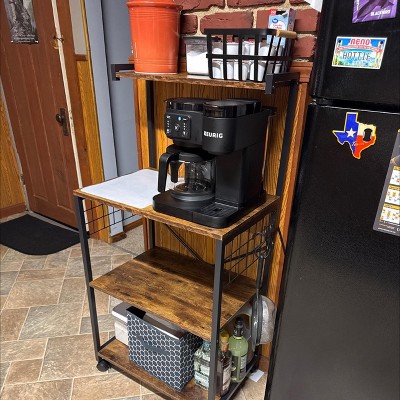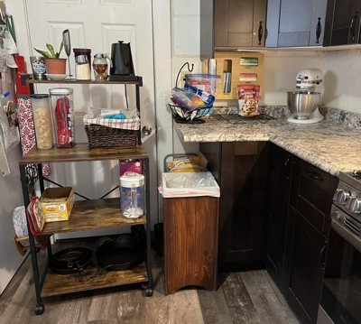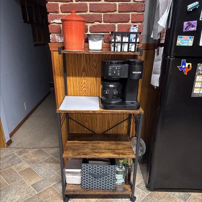 Used this near a kitchen that doesn't have nearly enough counter space and set it up to hold the microwave on the middle shelf and a coffee/tea station with all the necessary accessories (plus a toaster!) on the other shelving levels. Was easy to assemble and has been a great value.