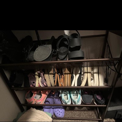 This 4-Tier shoe rack worked perfectly for my granddaughter's closet. The shoes are no longer lined up along the back wall of the closet and it looks much neater. I assembled it with the racks flat and her taller boots fit well on the top shelf. Her room is accented with gold so I painted the rack gold to match and it looks great. The wider frame makes this rack sturdier than the others you see with a thin spindle type frame.
