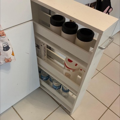 - Sliding Out Slim Storage Cart: Looking for a space saver? With the dimension of 19" x 5" x 32" (L x W x H), this slim storage cart fits effortlessly into narrow gaps, optimizing storage opportunities in compact areas. ^ Sorted Storage Space: The 4-tier utility cart provides ample storage capacity, allowing you to neatly store and categorize items including small seasoning jar, condiments and various drink bottles. More, the protective bars on each shelf are effective to prevent items from falling.^ Easy Movement & Lockable Design: Equipped with 4 smooth rolling casters, 2 of which are lockable, the kitchen cart is easy to move anywhere and keeps stability in place. The side metal bar plays dual role as a portable handle to facilitate moving and as a handy towel rack.^ Built for Strength: Constructed with durable material, this rolling storage cart is built for lasting strength and boasts rugged structure. In addition, solid connection and exquisite craftsmanship will withstand years use.^ Practical & Versatile Use: Such a practical and stylish storage cart wisely combines form and function. The utility cart can be used as a storage organizer or mobile serving cart in the kitchen, laundry, or living room. ^