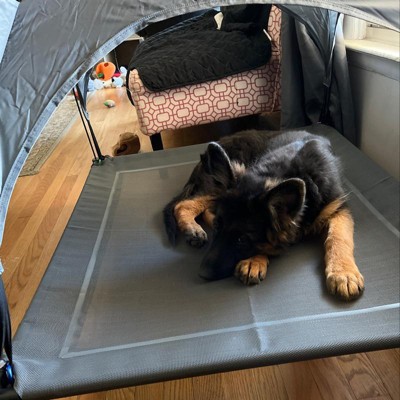 I bought this elevated dog bed at the beginning of summer for my labrador retriever. I needed something with a canopy so that she is shaded from the sun when it is warm outside. This dog bed has served us well these past few months. It still looks brand new, even though it has been heavily used by our dog all summer. It is made of a heavy mesh material which is made for your dog's comfort, and has sturdy iron tubes for the base of the bed. The bed is elevated and can accommodate large dogs without any problems. My dog is over 60lbs, and it holds her very well. The breathable mesh material keeps her nice and cool, and the removable canopy keeps her out of the sun. I recently found out during a rainstorm that it also blocks my dog from getting wet in the rain and the bed itself is also completely waterproof. This elevated dog bed was very easy to assemble within a few minutes without any tools. The feet are anti-skid, so it doesn't slide on whatever surface it sits on. This dog bed would also work well indoors, since it is very lightweight and easy to move from room to room. It is very easy to clean, since we just wash it with our outdoor garden hose. We have two labrador retrievers, and since they both fight over this elevated bed...it looks like I will be purchasing another one soon. Great quality dog bed that is worth every penny!