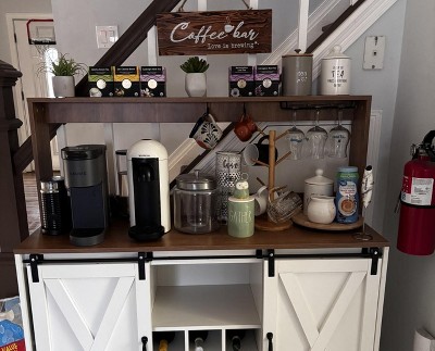 Costway 47.5" Farmhouse Coffee Bar Cabinet with Charging Station Glass Cup Holders Hutch