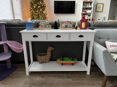 - Simple but Modern Style: Comes with smooth surface and simple lines, our sofa table with three drawers has a good look. The whole table frame is covered with white paint so it is suitable for matching your style decoration style in your home. The table has a unique groove design which adds a touch of fashion to this sofa side table.