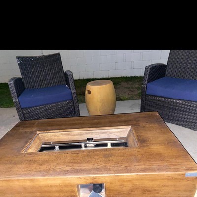 We LOVE this firepit. Easy to set up with a propane tank. Side table hides the propane tank nicely.