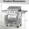 Our cabinet-style stainless steel propane gas grill comes with 460 sq.in of total cooking space, offering enough delicious food for family gatherings or large parties. And it has 2 side tables, offering more work and preparation space for seasonings and grilling tools. The 50000 BTU gas grill includes 4 main burners and a side burner, delivering powerful heat and a great grilling experience. And it adopts flame tamers for distributing even heat. You can also monitor the temperature in real time through the thermometer. Moreover, our cooking grates are constructed of heavy-duty chrome-plated metal, which is sturdy and sturdy enough, effectively preventing rusting or cracking. And the stainless steel lid ensures excellent heat retention for keeping food tasty. Other than that, it has a door cabinet to store your propane tank (not included) and grilling accessories. When not in use, you can easily move it with 4 flexible wheels. This propane gas grill can be a perfect complement to any outdoor space, such as the garden, patio, poolside, terrace, and more.