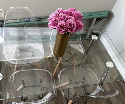 - 51'' Spacious Dining Table: Measuring 51'' x 27.5'' x 0.3'' (L x W x Thickness), the tabletop is spacious and sturdy enough to store different meals and kitchenware. And the glass tabletop is elegant and simple to maintain. Also, the round corners ensure higher safety. And the adjustable footpads improve the stability.