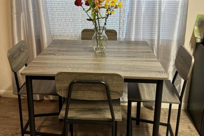 - 5-Piece Counter-Height Furniture Set: This 5-piece furniture set includes a counter-height dining table and 4 bar chairs, which is perfect for family meals or casual drinks with friends. The table measures 36" x 36" x 36" (L x W x H) and the chair measures 16" x 16" x 38" (L x W x H).^ Sturdy & Stable Construction: The dining table and chairs are supported by high-strength powder-coated metal frames, ensuring good sturdiness and a large loading capacity (weight capacity of the table is 200 lbs, and weight capacity of each chair is 330 lbs). And the bottom anti-scratch footpads enhance overall stability.^ Practical Dining Table: The dining table features a 44" x 28" spacious tabletop, providing a comfy dining area for you and your family. And it is crafted of premium veneered wood board, which is scratch-resistant and waterproof for easy cleaning.^ Space-Saving Design & Comfy Seat: 4 bar chairs can be tucked under the table when not in use, which can optimize the use of your living space and is suitable for small dining areas or apartments. The chair features a wide backrest and convenient footrests, providing a comfortable sitting experience.^ Rustic Style & Versatile Use: With its delicate wood grains and sleek metal supporting legs, this elegant and elegant and rustic 5-piece furniture set could perfectly blend into any home style. Whether for kitchens, dining rooms, clubs, leisure areas, bars, or coffee shops, this dining set can be a perfect choice.^