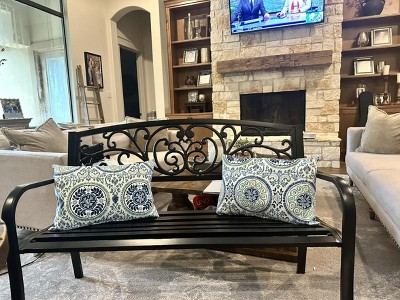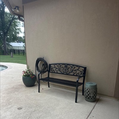 I add an excellent accent to my yard. the bench is heavy-duty metal. Very solid. Assembly was easy. The pattern on the back is beautiful. Perfect size and just fits next to the porch. I think it will last longer than my old wooden one.
